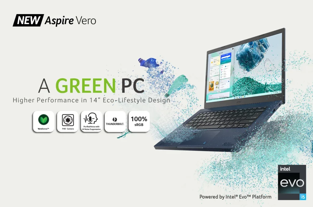 Laptop Green PC ini menggunakan material daur ulang PCR (post-consumer recycled) hingga 50% di keseluruhan laptop. Selain itu, kemasan laptop dan lembaran antara keyboard dan layar dibuat dari 100% material daur ulang industri, serta dalam proses produksinya, Aspire Vero juga menekan emisi karbon dioksida sebesar 21% dan tanpa menggunakan cat atau pewarna apapun.