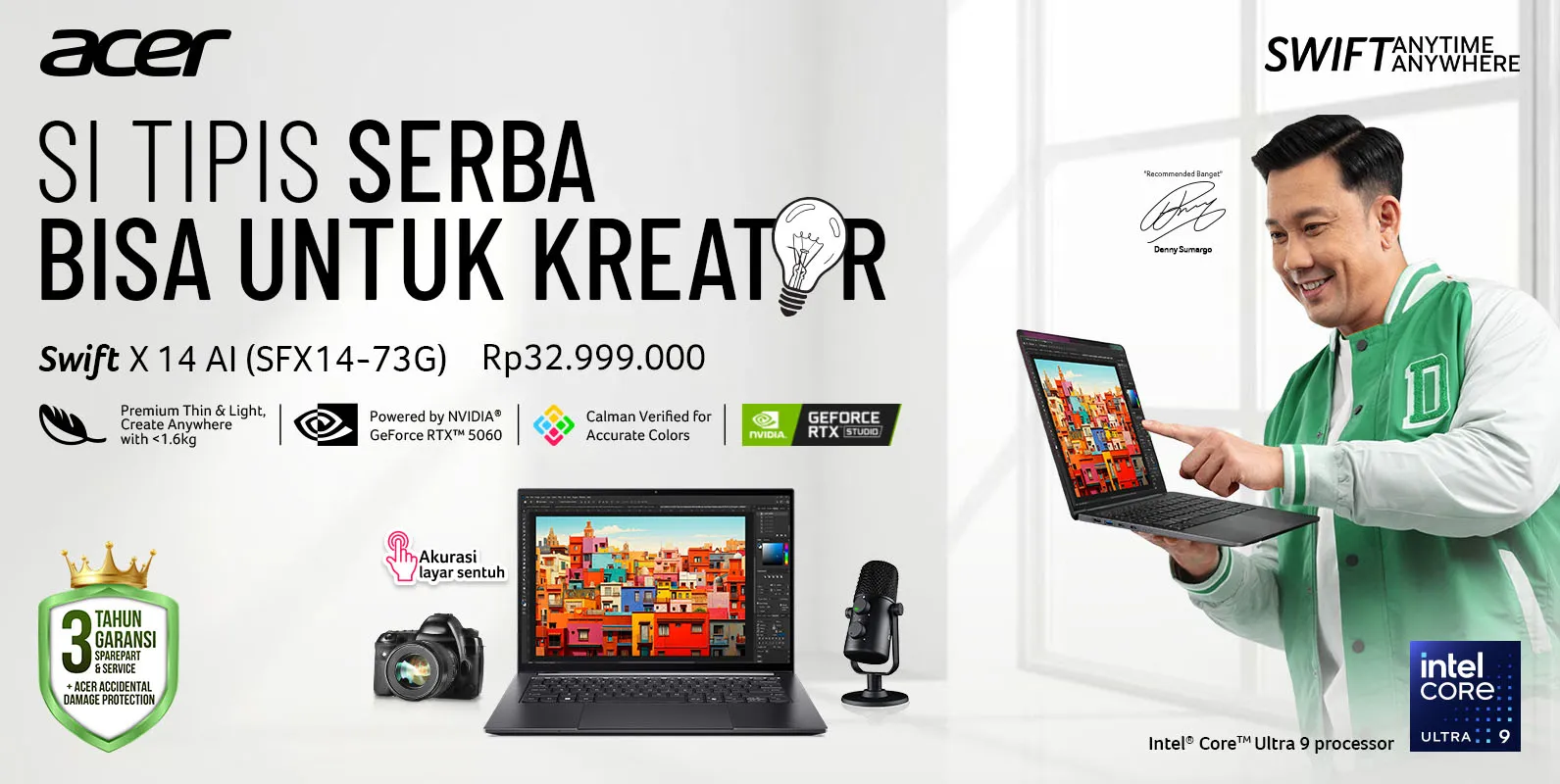 Pilihan laptop AI yang tipis dan ringan dari Acer, Acer Swift series ditenagai Intel® Core™ Ultra Processor dan Intel® AI Boost. Siap mendukungmu dalam segala aktivitas dengan aplikasi berbasis AI yang optimal serta daya tahan baterai yang awet, untuk meningkatkan setiap langkahmu setiap hari.