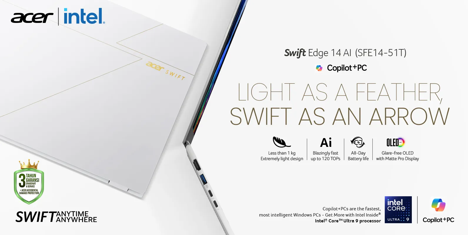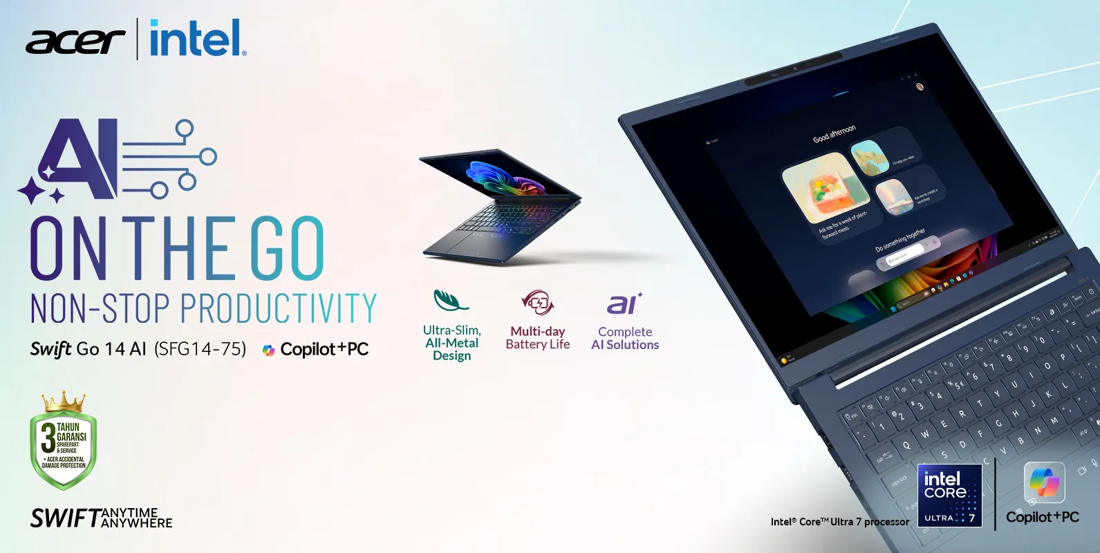 Sebagai laptop AI pertama, Swift Go with AI yang ditenagai Intel® Core™ Ultra 7 Processor dan Intel® AI Boost siap menemani segala aktivitasmu menggunakan aplikasi berbasis AI secara optimal. Dengan daya baterai yang panjang dan pengisian cepat, Swift Go with AI akan membuka banyak peluang baru untuk kamu lebih efisien mengatur produktivitas harianmu.